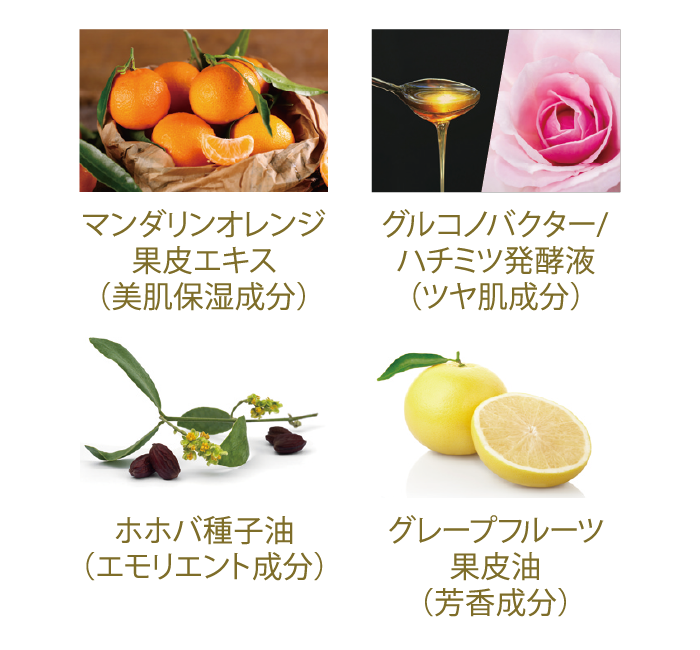 水、BG、グリセリン、ペンチレングリコール、エクトイン、シゾサッカロミセス/イチジク果実発酵液、キシリトール、無水キシリトール、キシリチルグルコシド、ヒアルロン酸Na、グルタチオン、マンダリンオレンジ果皮エキス、グルコノバクター/ハチミツ発酵液、乳酸桿菌/ハイビスカス花発酵液、フラーレン、ウメ果実エキス、ユキノシタエキス、α-グルカンオリゴサッカリド、ローズマリー葉エキス、バクチオール、ヒマワリ芽エキス、ホホバ種子油、オリーブ果実油、水添コメヌカ油、グレープフルーツ果皮油、水添レシチン、水添ホスファチジルコリン、フィトステロールズ、キサンタンガム、カルボマー、マルトデキストリン、アクリレーツクロスポリマー-2-Na、PVP、クエン酸、クエン酸Na、水酸化Na、フェノキシエタノール