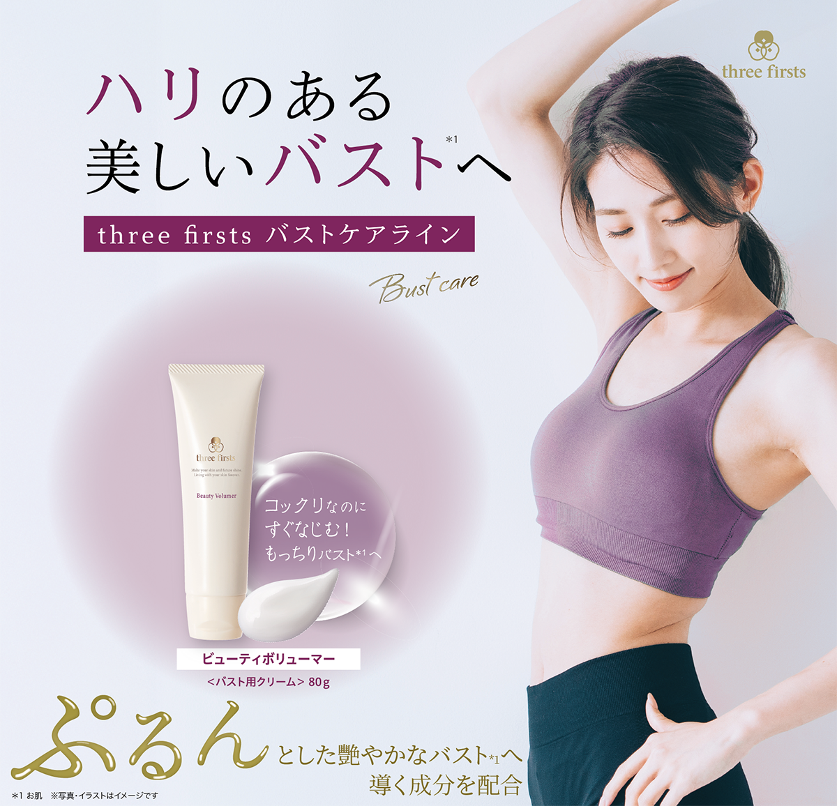 適量を手にとり、バスト全体を持ち上げるようなイメージで丁寧になじませてください。気になる部分には重ねづけをしてください。