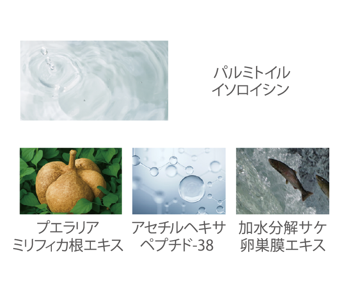 水、BG、グリセリン、ミリスチン酸オクチルドデシル、ペンチレングリコール、(C15-19)アルカン、ジステアリン酸ポリグリセリル-3メチルグルコース、水添ナタネ油アルコール、プエラリアミリフィカ根エキス、アセチルヘキサペプチド-38、加水分解サケ卵巣膜エキス、パルミトイルイソロイシン、乳酸桿菌/ハイビスカス花発酵液、フラーレン、ウメ果実エキス、ユキノシタエキス、α-グルカンオリゴサッカリド、ローズマリー葉エキス、バクチオール、ヒマワリ芽エキス、エクトイン、シゾサッカロミセス/イチジク果実発酵液、キシリトール、無水キシリトール、キシリチルグルコシド、ヒアルロン酸Na、ジヒドロキシプロピルアルギニンHCl、水添コメヌカ油、水添ホスファチジルコリン、フィトステロールズ、加水分解水添デンプン、グリコシルトレハロース、キサンタンガム、カルボマー、ダイマージリノール酸(フィトステリル/イソステアリル/セチル/ステアリル/ベヘニル)、プルラン、マルトデキストリン、ステアロイルグルタミン酸Na、PVP、クエン酸、クエン酸Na、HEDTA-3Na、水酸化Na、エチルヘキシルグリセリン、カプリル酸グリセリル、ステアリン酸グリセリル、フェノキシエタノール