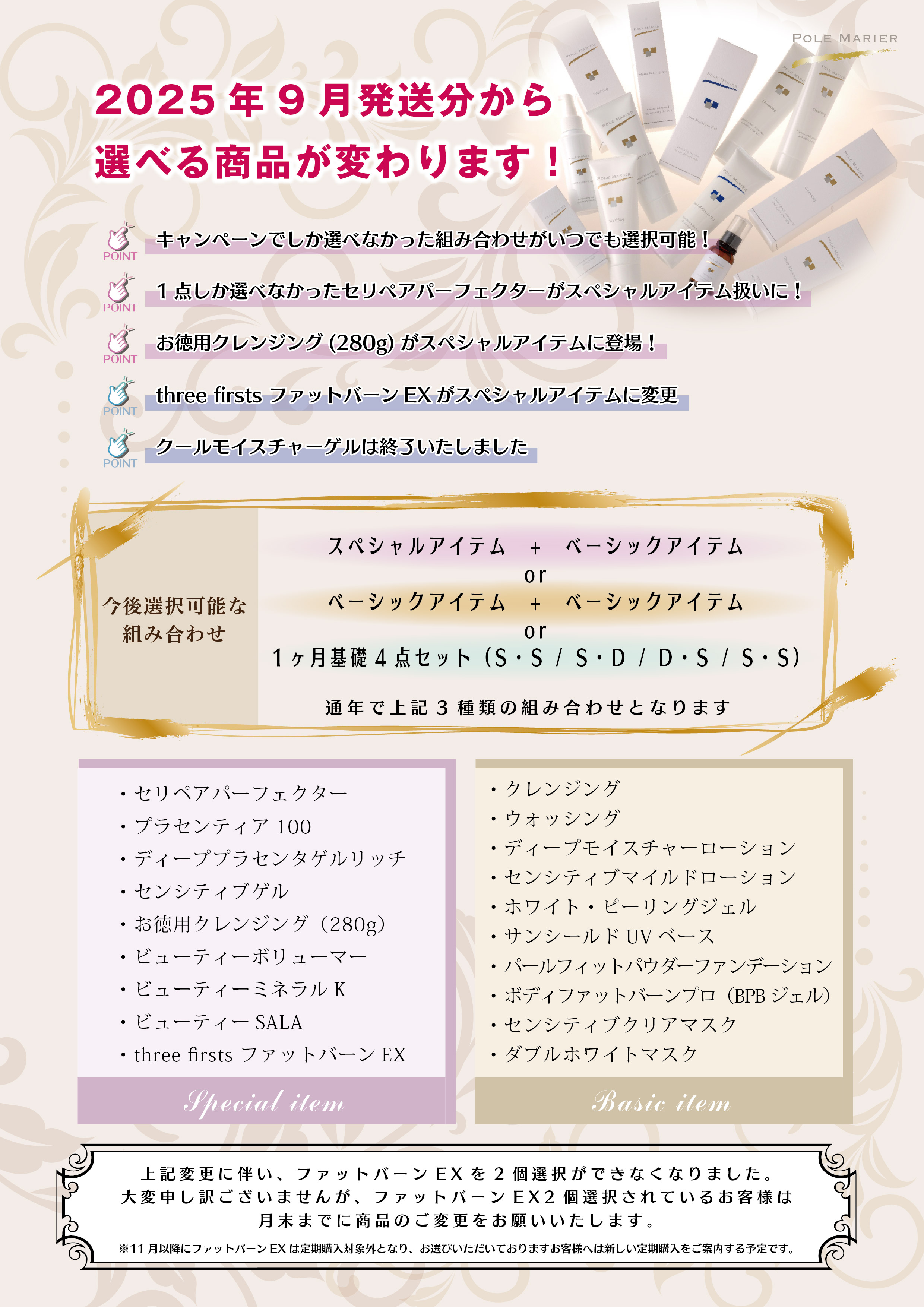 平素よりポールマリエ化粧品をご愛用いただきましてありがとうございます。 2025年9月発送分より定期購入の選べる商品が変更となります。 詳しくは 『定期購入の選べる商品の変更』 よりご確認ください。 また上記に伴い、ファットバーンEXを2つご選択いただいているお客様は必ず商品のご変更をお願いいたします。